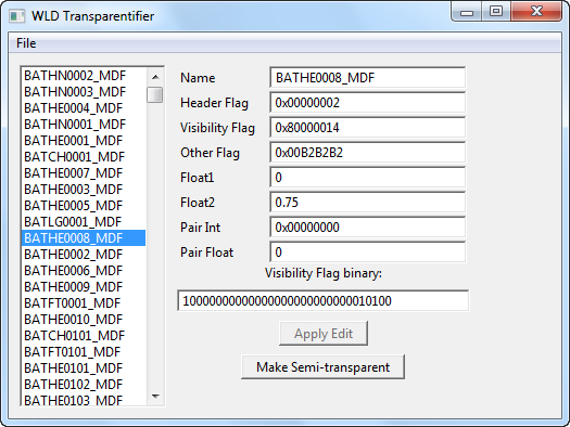 The names should line up with the names of .bmp files in the .s3d. Most of the data fields on the right have unknown functions (and are presented just in case anyone might want to try to figure someting out by looking for patterns), but the one we're interested in is the "Visibility Flag". Typical textures have values like 0x80000013 or 0x80000014. The "Visibility Flag binary" field represents the same value, but in binary (obviously). This field can be edited; each of the ones and zeros potentially corresponds to one setting being turned on or off for that texture. Which bits do what has not been thoroughly tested, but the user is free to experiment. On the other hand, if you just want to make something semi-transparent, a button is provided to do just that. Note that the button is not very smart -- it justs pastes 0x80000017 over the current value rather than setting specific bits (I'm too lazy to puzzle out exactly which bits are needed just yet). This should work fine for textures that have values of 0x80000013 or 0x80000014 beforehand, but may cause crashes on others.