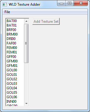 - Run Texture Adder and select the .wld file from File > Load WLD. This will produce a list of model texture sets, like so: