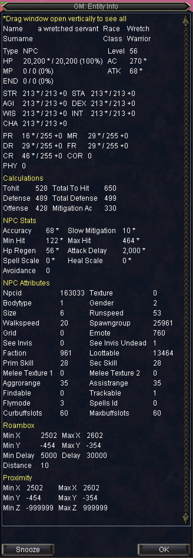 | *type | *level | ac | hp | accuracy | slow_mitigation | attack | strength | stamina | dexterity | agility | intelligence | wisdom | charisma | magic_resist | cold_resist | fire_resist | poison_resist | disease_resist | corruption_resist | physical_resist | min_dmg | max_dmg | hp_regen_rate | attack_delay | spell_scale | heal_scale | special_abilities |